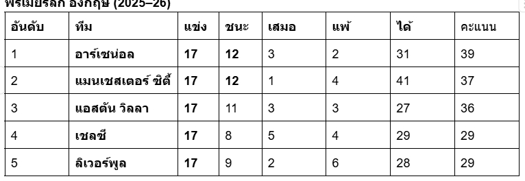 • อาร์เซนอลยังนำเป็นจ่าฝูงตามด้วยแมนเชสเตอร์ ซิตี้ และแอสตัน วิลล่า ตามลำดับ
