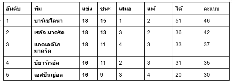 ตารางคะแนนล่าสุด (อ้างอิงตามรายงานเมื่อกลางเดือน ธ.ค.)